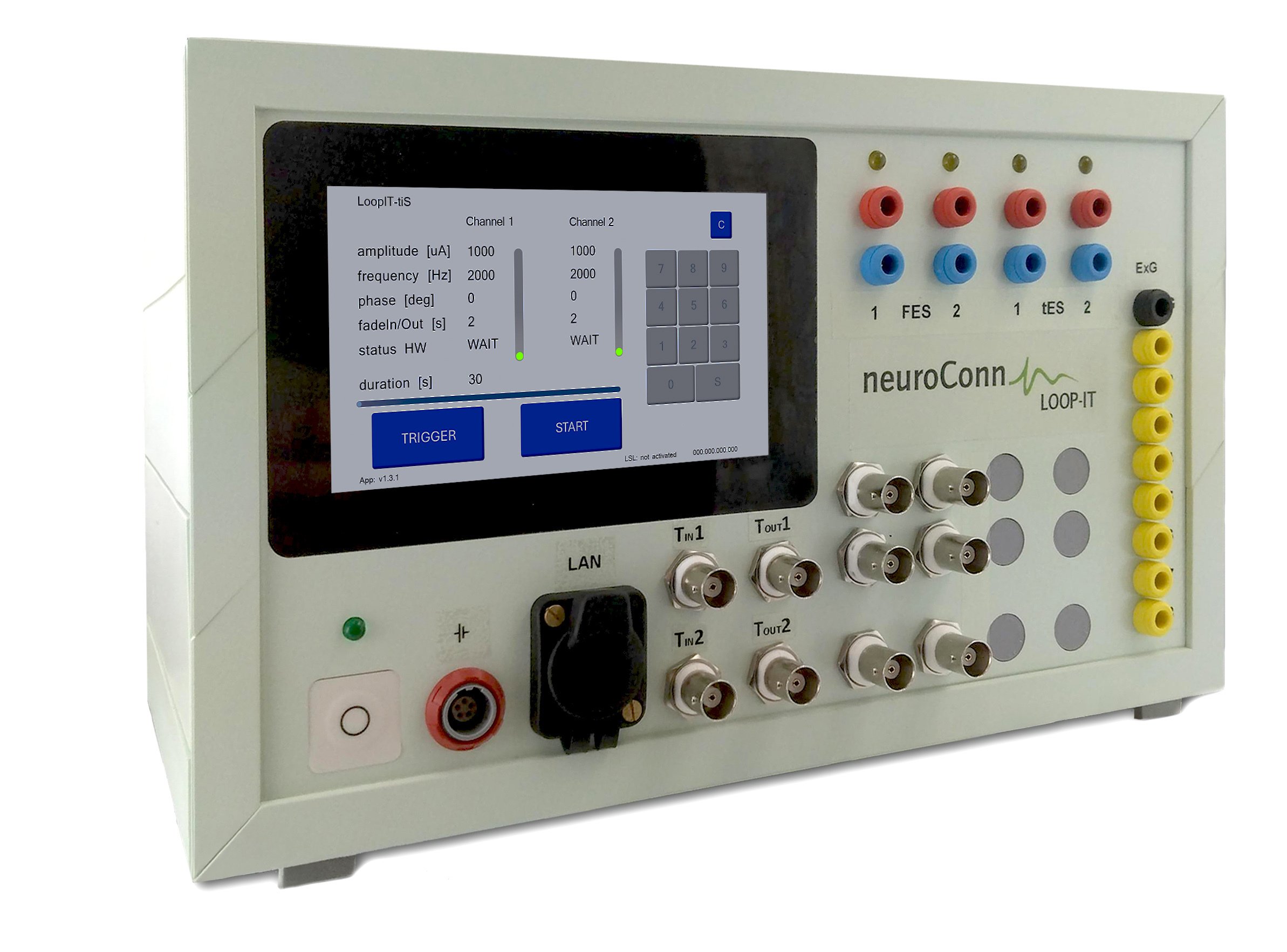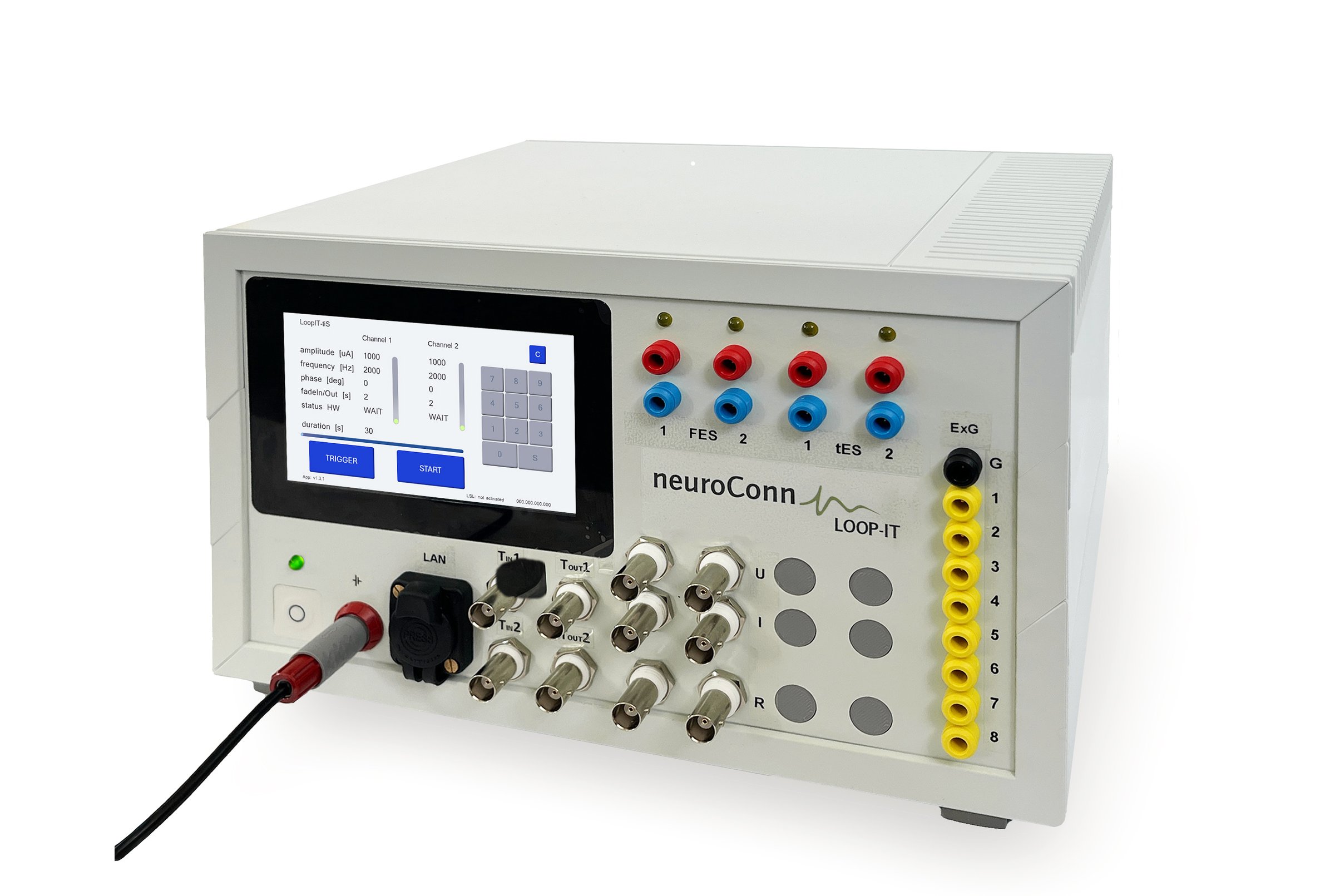 此外,LOOP-IT FES 在 tES 和 NMES / FES 通道的电极上记录所施加的电流和电压,并允许通过 REMOTE INPUT 在所有 NMES / FES 通道的电极上进行任意电流刺激。